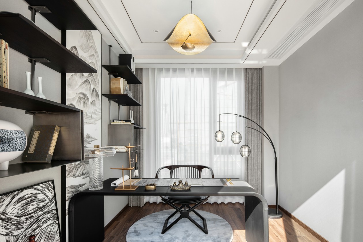 新中式书房的布局一般都讲究四平八稳、工整对称。工作区可以设置在书房的中心,具体的摆设可以根据业主的个人喜好摆设。按照惯例,大型的书柜书架靠里,书桌放置在窗边,跟书柜的距离不能太远。新中式书房的传统文化元素浓厚,为了满足文化方面的需求,可以摆放移动式的小矮桌,以供使用者阅读、抚琴、下棋之用。毕竟不同人对于书房的定义都不一样,喜欢在书房处理工作文件的要以书桌为主,喜欢在书房写书法作画的则要以书案或者是画案为主。
