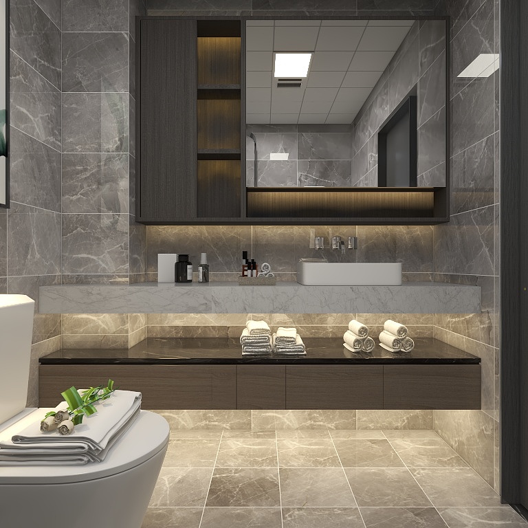 卫生间小,最好在不同地点使用多个光源,既能避免照镜子时脸部出现阴影,还能让整个空间更加明亮开放。淋浴区因为要考虑到防水的问题,因此灯具设计多为顶部的筒灯及隐藏灯带设计。